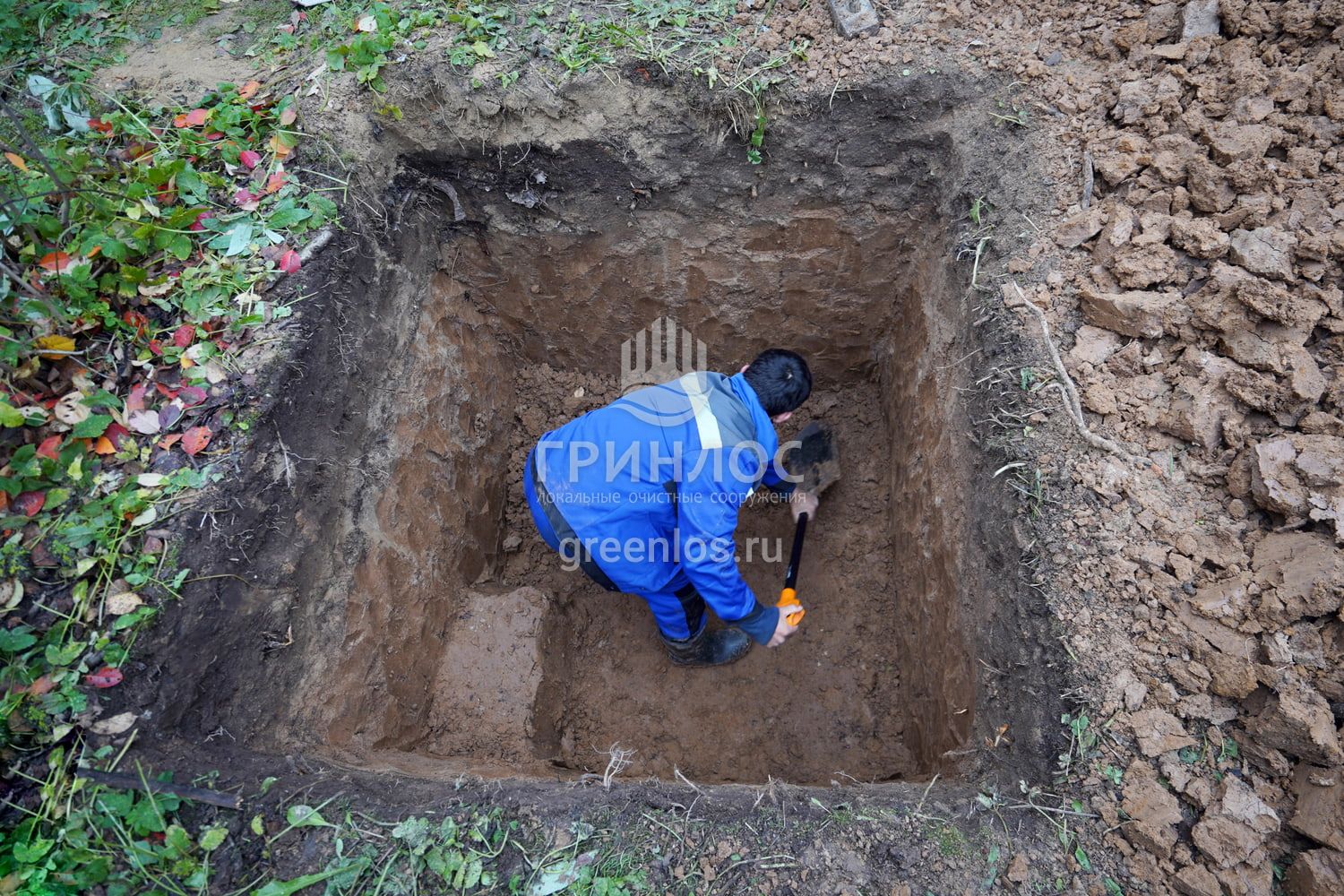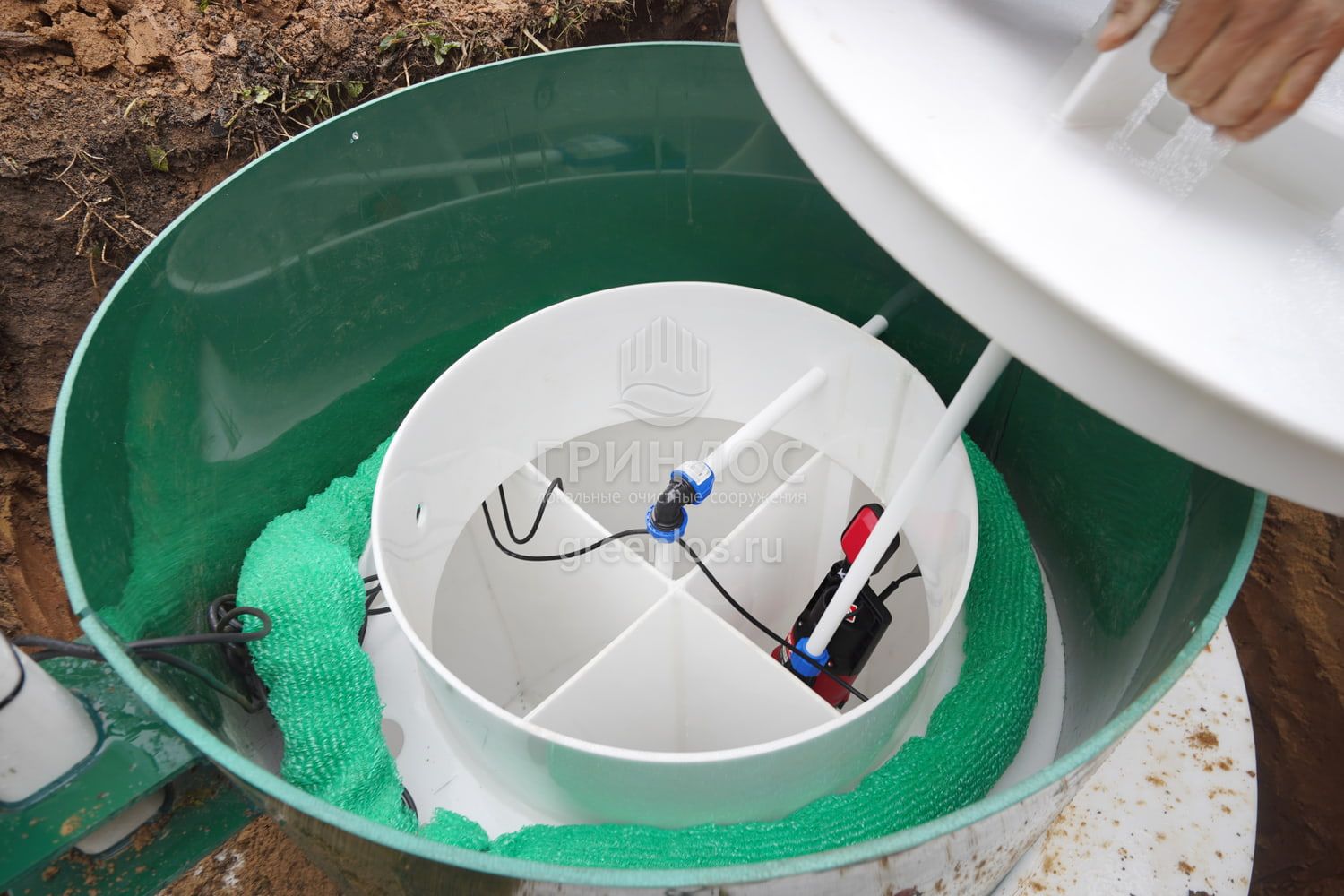 Доставка септика ГРИНЛОС Аква 3 Пр на загородный участок заказчика. Выбор места для установки. Подготовка котлована и траншей, установка септика, прокладка трубопровода, засыпка септика и труб песком. Для проверки работы системы был выполнен пробный запуск оборудования.
