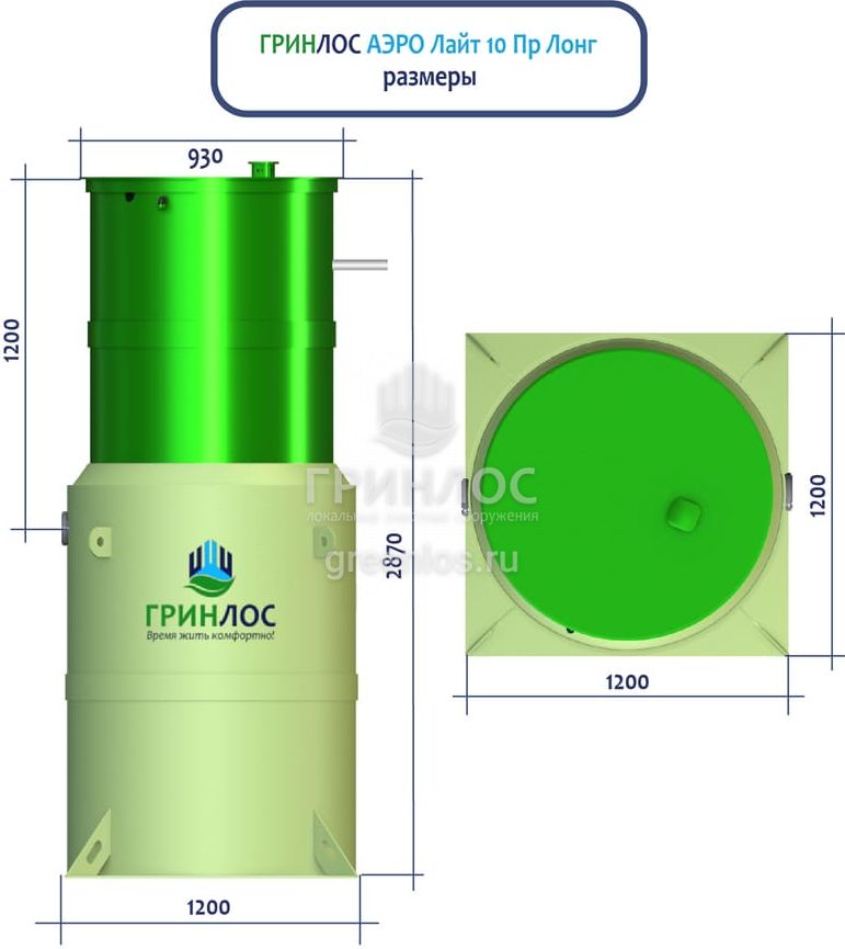Высота корпуса Гринлос Аэро Лайт 10 ПР Лонг — 2.87 м, а врезка подводящей трубы осуществляется на глубине до 120 см. Станция подходит для монтажа во все виды почв: песок, глина, суглинок, грунты с высоким уровнем грунтовых вод.