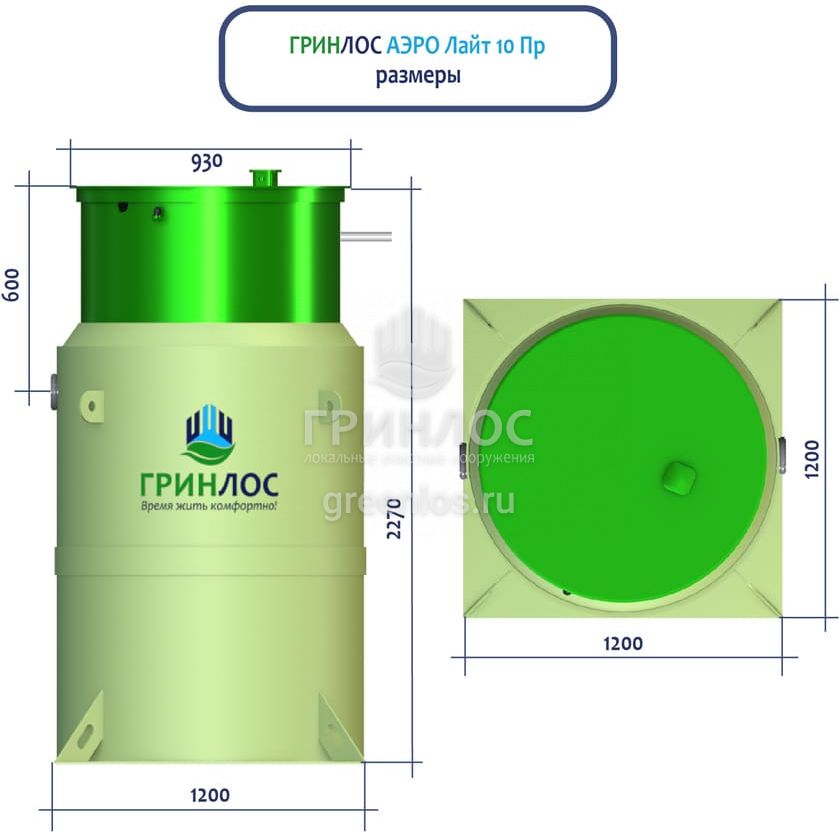 Высота корпуса Гринлос Аэро Лайт 10 ПР — 2.27 м, а врезка подводящей трубы осуществляется на глубине до 60 см. Станция подходит для монтажа во все виды почв: песок, глина, суглинок, грунты с высоким уровнем грунтовых вод.