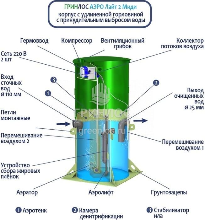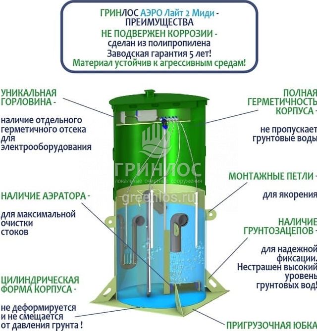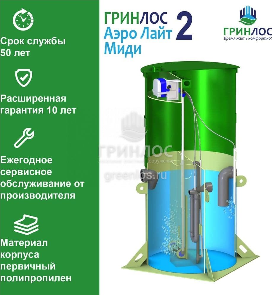 Отличительными особенностями септика Гринлос Аэро Лайт 2 Миди являются: