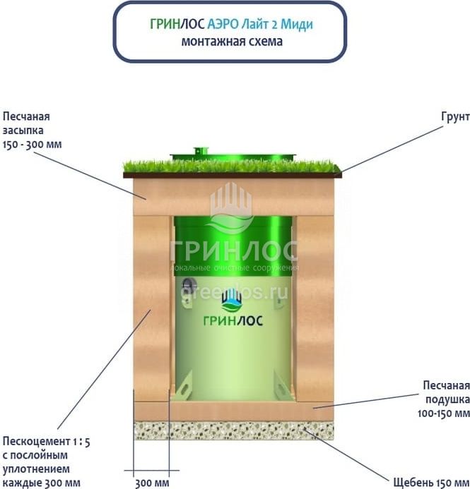 Поверх корпуса Гринлос Аэро Лайт 2 Миди выполняется песчаная обсыпка на высоту 150-300 мм. Для подсоединения оборудования к внутренней канализационной магистрали применяют канализационные трубы, предназначенные для эксплуатации.