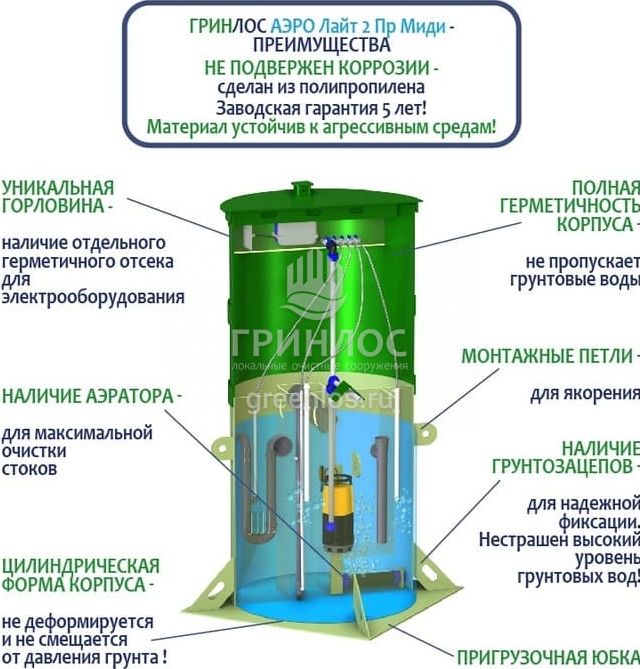 Отличительными особенностями септика Гринлос Аэро Лайт 2 Пр Миди являются: