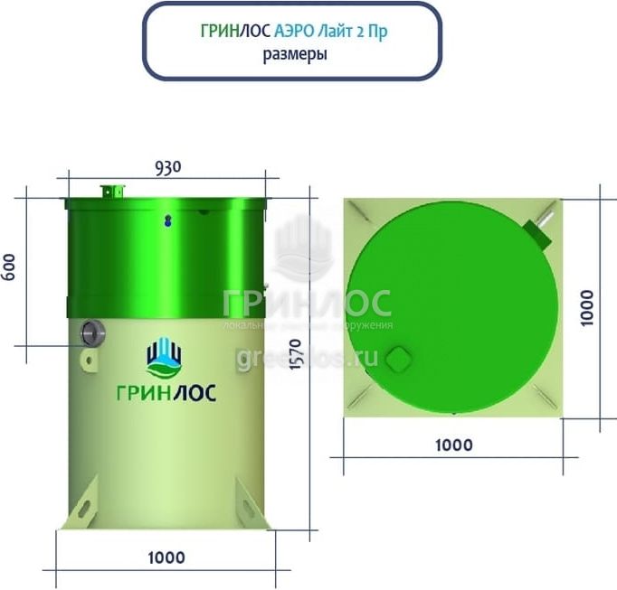 Высота корпуса Гринлос Аэро Лайт 2 Пр — 1.57 м, а врезка подводящей трубы осуществляется на глубине до 60 см. Станция подходит для монтажа во все виды почв: песок, глина, суглинок, грунты с высоким уровнем грунтовых вод.