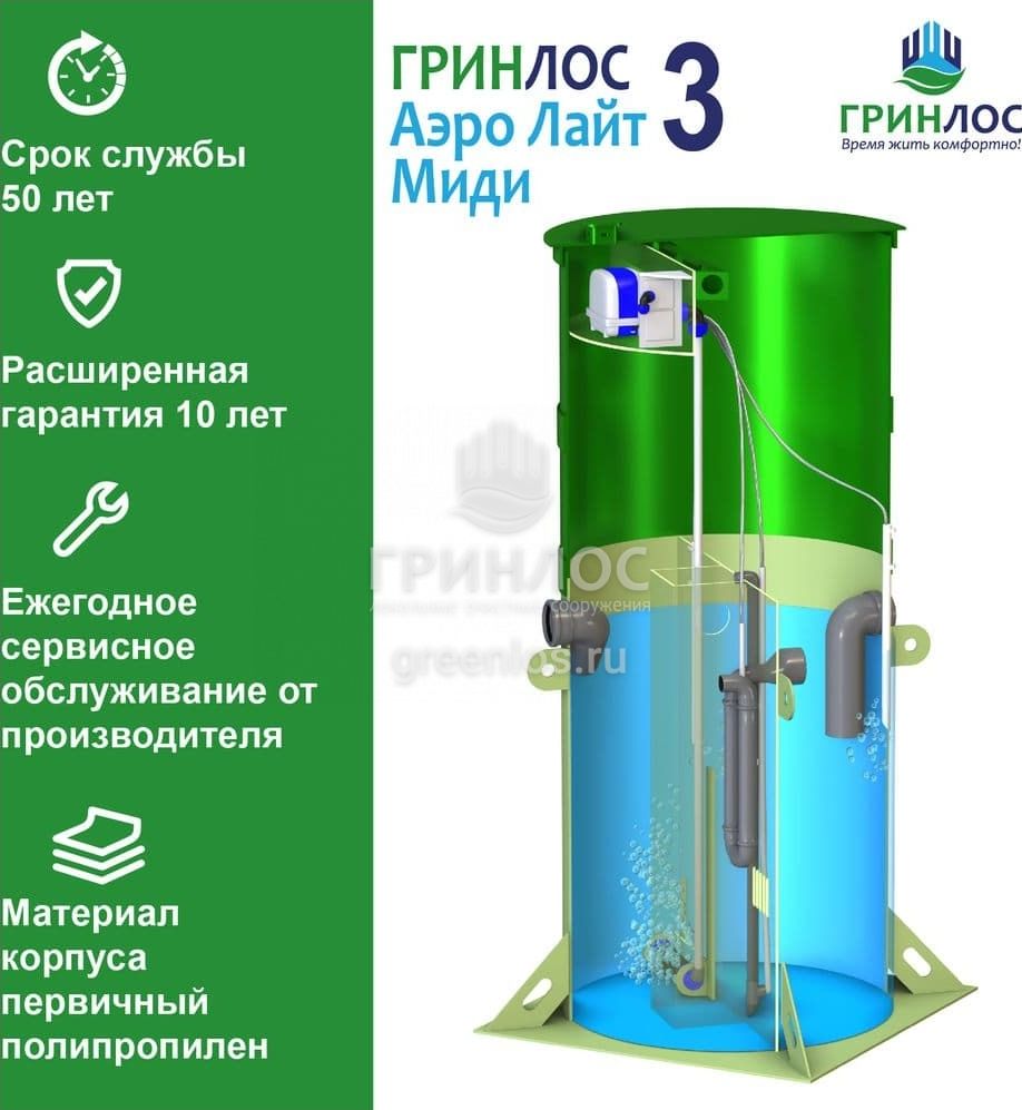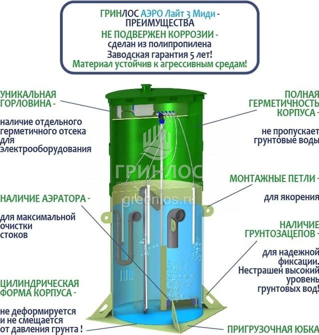 Отличительными особенностями септика Гринлос Аэро Лайт 3 Миди являются: