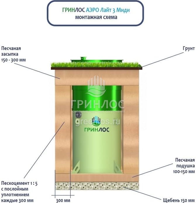 Поверх корпуса Гринлос Аэро Лайт 3 Миди выполняется песчаная обсыпка на высоту 150-300 мм. Для подсоединения оборудования к внутренней канализационной магистрали применяют канализационные трубы, предназначенные для эксплуатации.