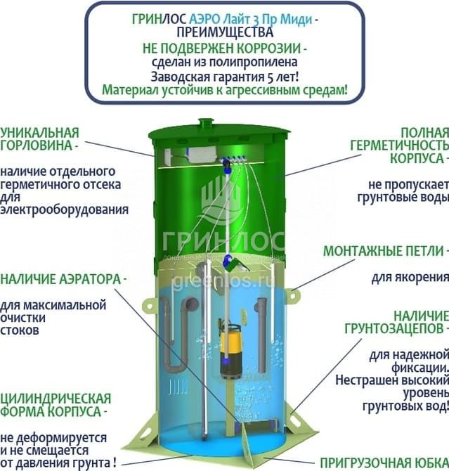 Отличительными особенностями септика Гринлос Аэро Лайт 3 Пр Миди являются: