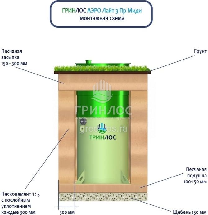 Поверх корпуса Гринлос Аэро Лайт 3 Пр Миди выполняется песчаная обсыпка на высоту 150-300 мм. Для подсоединения оборудования к внутренней канализационной магистрали применяют канализационные трубы, предназначенные для эксплуатации.