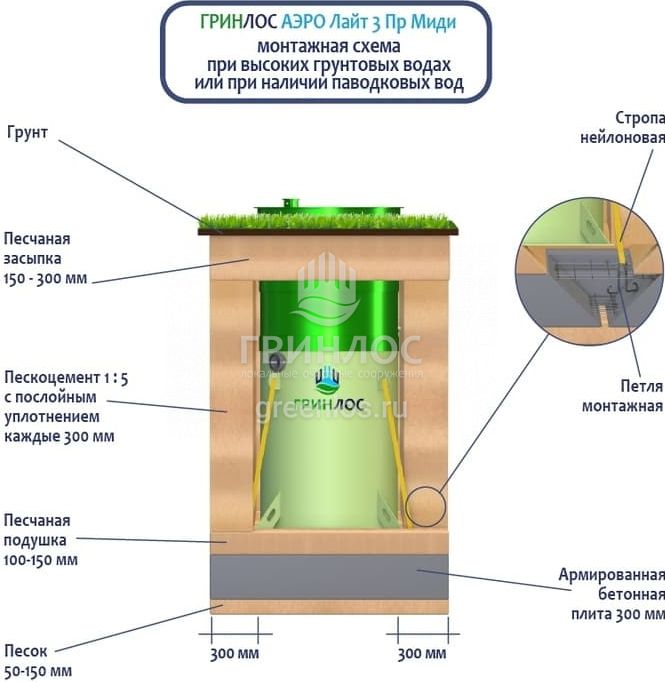 Станции очистки Гринлос Аэро Лайт 3 Пр Миди обладают надежными грунтозацепами, действительно предотвращающими всплытие оборудования на обводненных участках.
