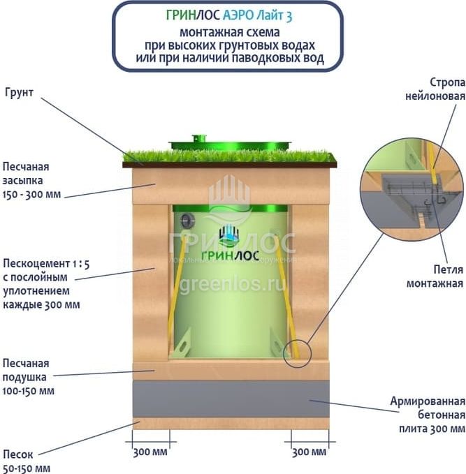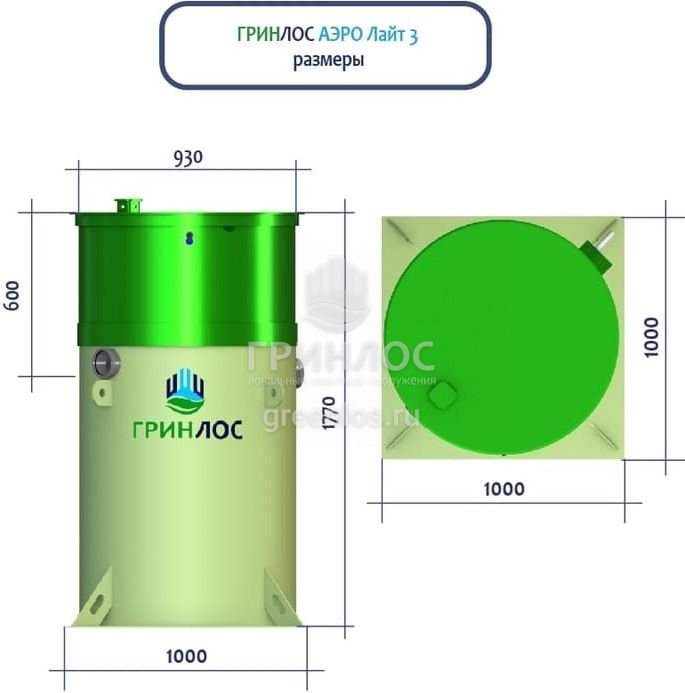 Высота корпуса Гринлос Аэро Лайт 3 — 1.77 м, а врезка подводящей трубы осуществляется на глубине до 60 см. Станция подходит для монтажа во все виды почв: песок, глина, суглинок, грунты с высоким уровнем грунтовых вод.