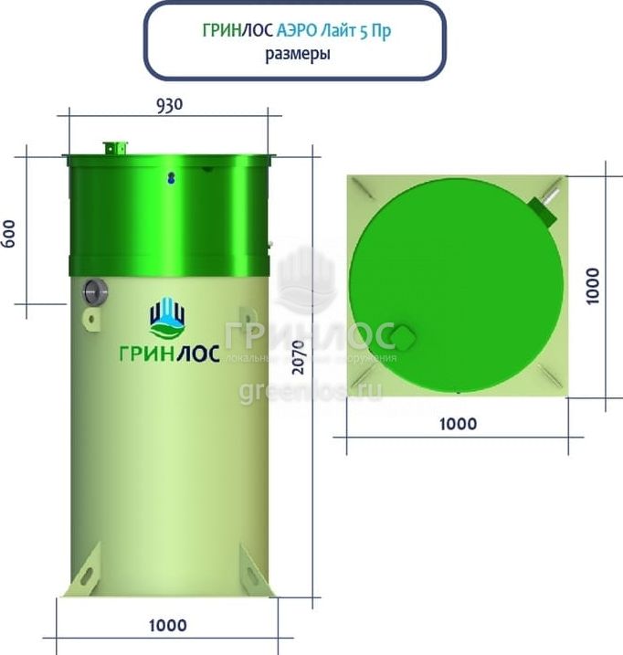 Высота корпуса Гринлос Аэро Лайт 5 Пр — 2.07 м, а врезка подводящей трубы осуществляется на глубине до 60 см. Станция подходит для монтажа во все виды почв: песок, глина, суглинок, грунты с высоким уровнем грунтовых вод.