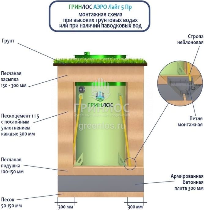 Станции очистки Гринлос Аэро Лайт 5 Пр обладают надежными грунтозацепами, действительно предотвращающими всплытие оборудования на обводненных участках.