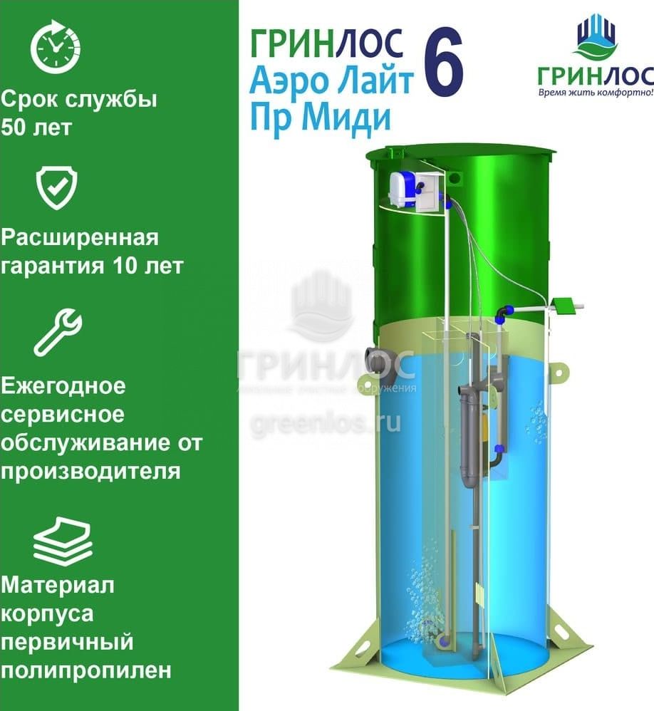 Отличительными особенностями септика Гринлос Аэро Лайт 6 Пр Миди являются: