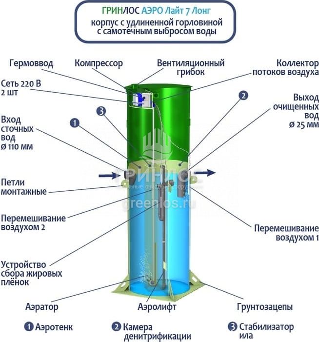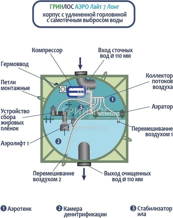 Станция Гринлос Аэро Лайт 7 Лонг сконструирована таким образом, что все камеры, в которых происходит аэрация, разделение и осветление стоков объединены в одном корпусе цилиндрической формы.