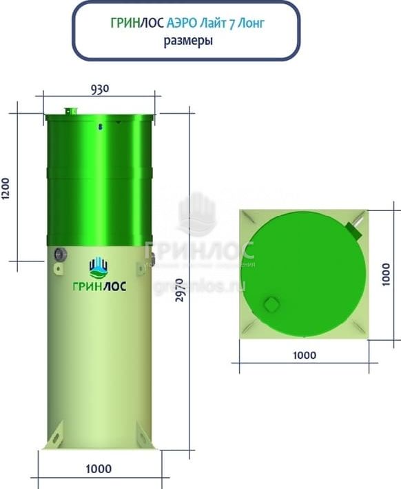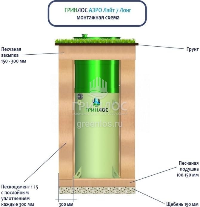 Высота корпуса Гринлос Аэро Лайт 7 Лонг — 2.97 м, а врезка подводящей трубы осуществляется на глубине до 120 см. Станция подходит для монтажа во все виды почв: песок, глина, суглинок, грунты с высоким уровнем грунтовых вод.