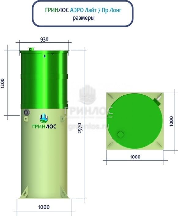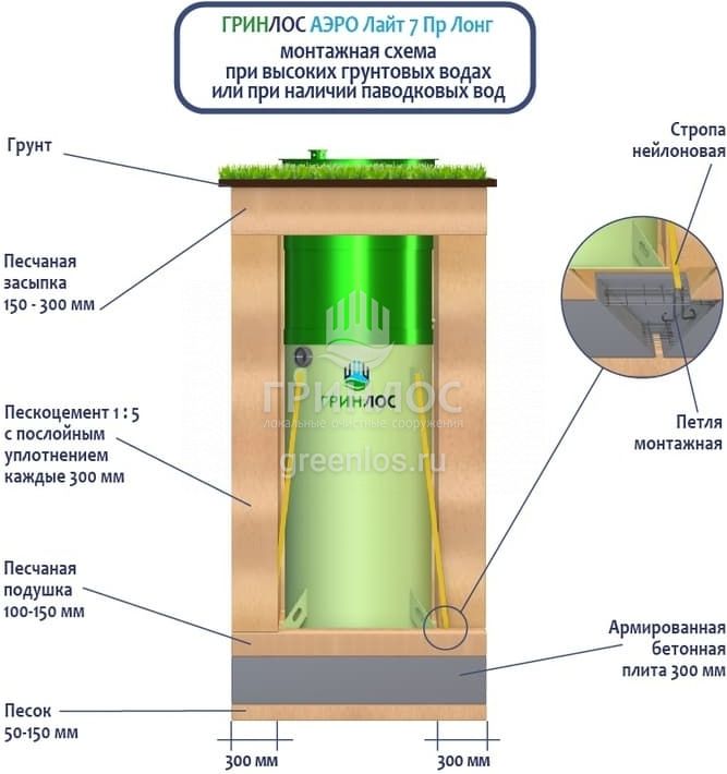 Высота корпуса Гринлос Аэро Лайт 7 Пр Лонг — 2.97 м, а врезка подводящей трубы осуществляется на глубине до 120 см. Станция подходит для монтажа во все виды почв: песок, глина, суглинок, грунты с высоким уровнем грунтовых вод.