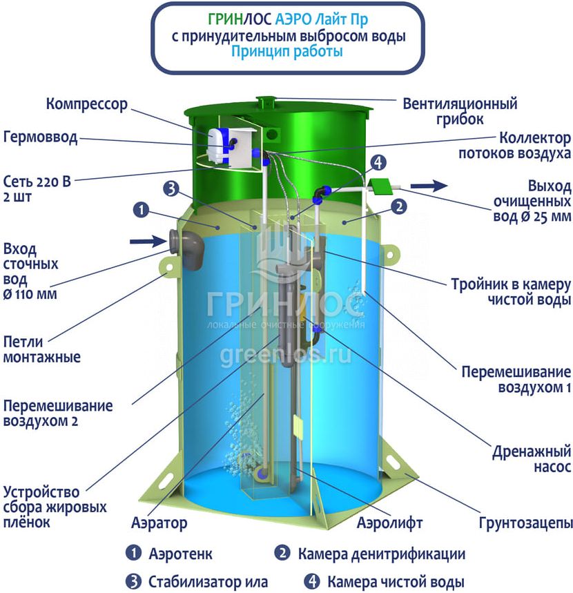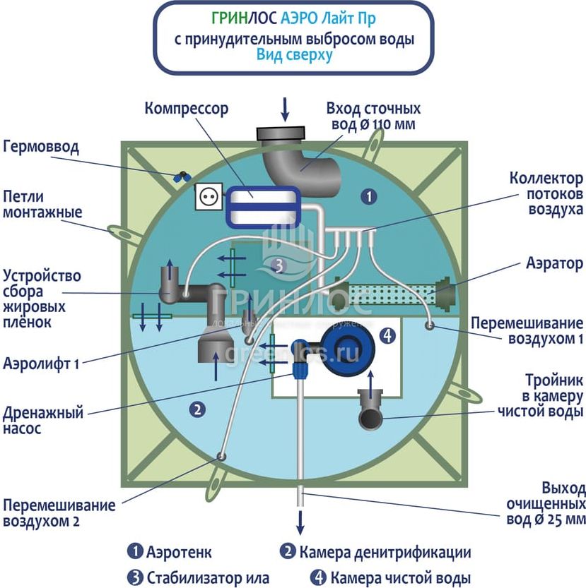 Септики ГРИНЛОС ГРИНЛОС Аэро Лайт оснащены аэратором, нагнетающим воздух для размножения аэробных бактерий. Вместе с анаэробными бактериями в биозагрузке это позволяет добиться максимальной переработки стоков.