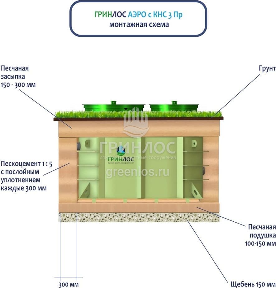 Поверх корпуса Гринлос Аэро с КНС 3 Пр выполняется песчаная обсыпка на высоту 150-300 мм. Для подсоединения оборудования к внутренней канализационной магистрали применяют канализационные трубы, предназначенные для эксплуатации.