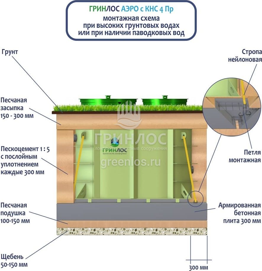 Поверх корпуса Гринлос Аэро с КНС 4 Пр выполняется песчаная обсыпка на высоту 150-300 мм. Для подсоединения оборудования к внутренней канализационной магистрали применяют канализационные трубы, предназначенные для эксплуатации.