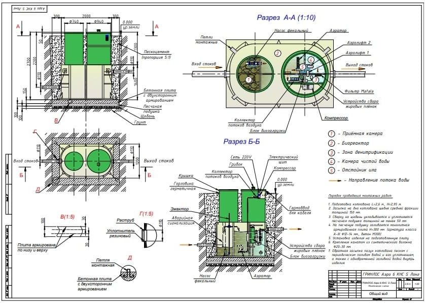 Перед непосредственным монтажом Гринлос Аэро с КНС 6 Супер Лонг специалисты осуществляют подготовку котлована. Его размеры определяются конструктивными особенностями выбранной модели оборудования. Ознакомиться с данными параметрами можно в приложении к ПС.