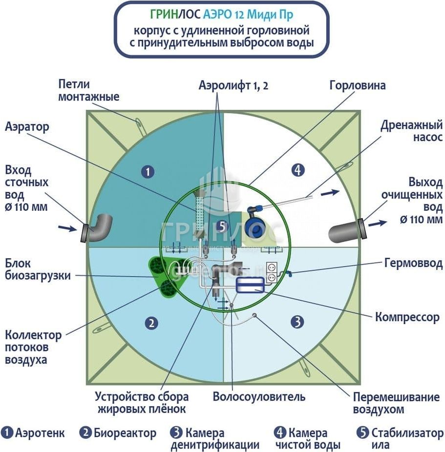 Станция ГРИНЛОС Аэро 12 Пр Миди сконструирована таким образом, что все камеры, в которых происходит аэрация, разделение и осветление стоков объединены в одном корпусе цилиндрической или овальной формы.