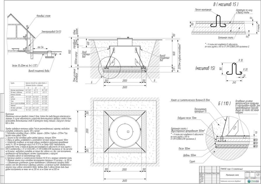 Целесообразно доверить выбор и монтаж оборудования специализированной компании. Перед непосредственным монтажом Оборудования специалисты осуществляют подготовку котлована. Его размеры определяются конструктивными особенностями выбранной модели оборудования. Ознакомиться с данными параметрами можно в приложении к ПС. По боковым стенкам корпуса должно быть сохранено свободное расстояние до грунта не менее 250 мм. Дно котлована нуждается в более тщательной подготовке. Его подвергают выравниванию с последующей засыпкой слоем песка, обладающим толщиной в пределах 10-15 см. Пазухи котлована подвергают обратной засыпке при помощи песка, который послойно поливают водой. Прежде чем приступить к аналогичным работам, емкость оборудования на четверть заполняют водой. Впоследствии количество воды внутри емкости увеличивают соразмерно уровню засыпки песком наружных стенок. Каждые 200 мм песка подвергаются ручному уплотнению.