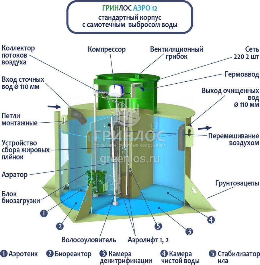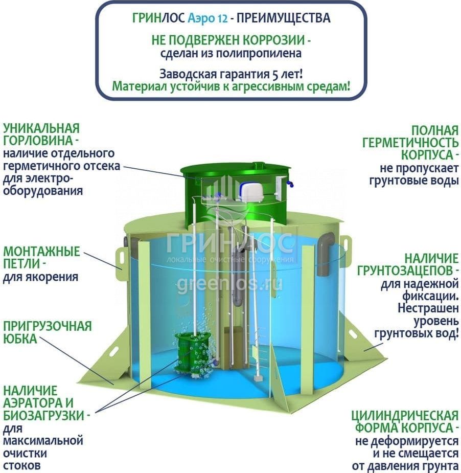 Отличительными особенностями септика ГРИНЛОС Аэро 12 являются:
