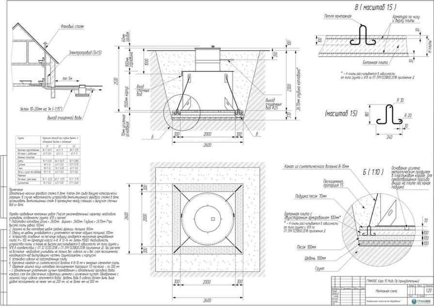 Целесообразно доверить выбор и монтаж оборудования специализированной компании. Перед непосредственным монтажом Оборудования специалисты осуществляют подготовку котлована. Его размеры определяются конструктивными особенностями выбранной модели оборудования. Ознакомиться с данными параметрами можно в приложении к ПС. По боковым стенкам корпуса должно быть сохранено свободное расстояние до грунта не менее 250 мм. Дно котлована нуждается в более тщательной подготовке. Его подвергают выравниванию с последующей засыпкой слоем песка, обладающим толщиной в пределах 10-15 см. Пазухи котлована подвергают обратной засыпке при помощи песка, который послойно поливают водой. Прежде чем приступить к аналогичным работам, емкость оборудования на четверть заполняют водой. Впоследствии количество воды внутри емкости увеличивают соразмерно уровню засыпки песком наружных стенок. Каждые 200 мм песка подвергаются ручному уплотнению.