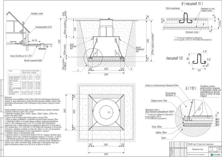 Целесообразно доверить выбор и монтаж оборудования специализированной компании. Перед непосредственным монтажом Оборудования специалисты осуществляют подготовку котлована. Его размеры определяются конструктивными особенностями выбранной модели оборудования. Ознакомиться с данными параметрами можно в приложении к ПС. По боковым стенкам корпуса должно быть сохранено свободное расстояние до грунта не менее 250 мм. Дно котлована нуждается в более тщательной подготовке. Его подвергают выравниванию с последующей засыпкой слоем песка, обладающим толщиной в пределах 10-15 см. Пазухи котлована подвергают обратной засыпке при помощи песка, который послойно поливают водой. Прежде чем приступить к аналогичным работам, емкость оборудования на четверть заполняют водой. Впоследствии количество воды внутри емкости увеличивают соразмерно уровню засыпки песком наружных стенок. Каждые 200 мм песка подвергаются ручному уплотнению.