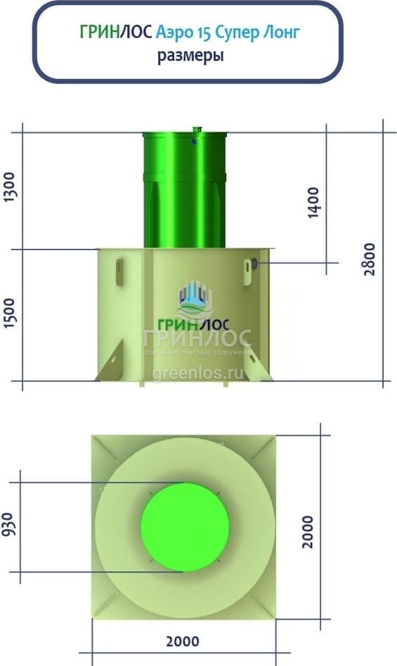 ГРИНЛОС Аэро 15 Супер Лонг – это станция биологической очистки сточных вод аэрационного типа. Максимальный залповый сброс в септик равен 1100 л, а производительность станции равна 3 м3/сутки, что рассчитано на обслуживание 15 условных пользователей.