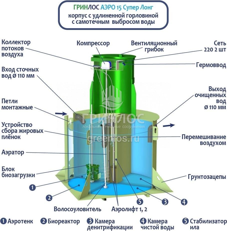 Станция ГРИНЛОС Аэро 15 Супер Лонг сконструирована таким образом, что все камеры, в которых происходит аэрация, разделение и осветление стоков объединены в одном корпусе цилиндрической или овальной формы.
