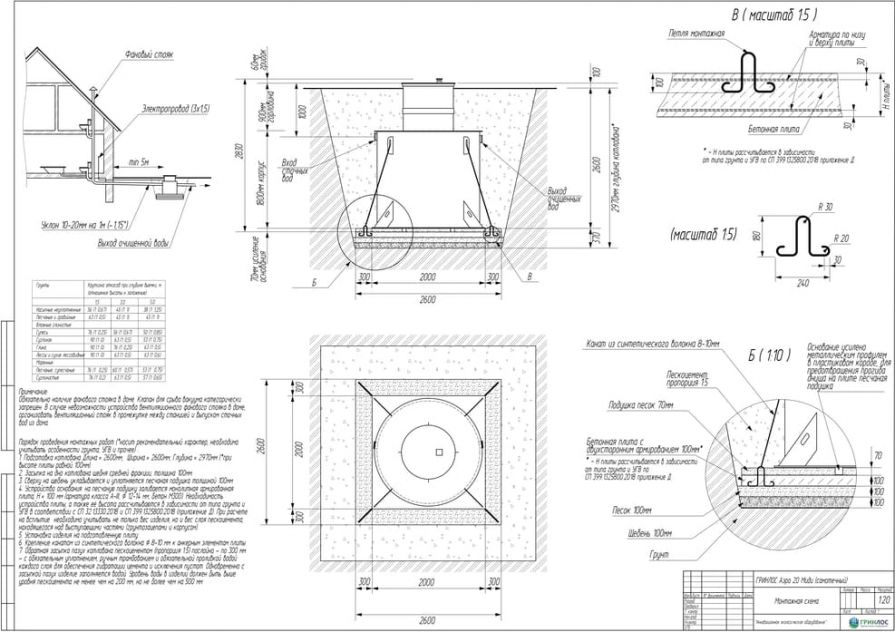 Целесообразно доверить выбор и монтаж оборудования специализированной компании. Перед непосредственным монтажом Оборудования специалисты осуществляют подготовку котлована. Его размеры определяются конструктивными особенностями выбранной модели оборудования. Ознакомиться с данными параметрами можно в приложении к ПС. По боковым стенкам корпуса должно быть сохранено свободное расстояние до грунта не менее 250 мм. Дно котлована нуждается в более тщательной подготовке. Его подвергают выравниванию с последующей засыпкой слоем песка, обладающим толщиной в пределах 10-15 см. Пазухи котлована подвергают обратной засыпке при помощи песка, который послойно поливают водой. Прежде чем приступить к аналогичным работам, емкость оборудования на четверть заполняют водой. Впоследствии количество воды внутри емкости увеличивают соразмерно уровню засыпки песком наружных стенок. Каждые 200 мм песка подвергаются ручному уплотнению.