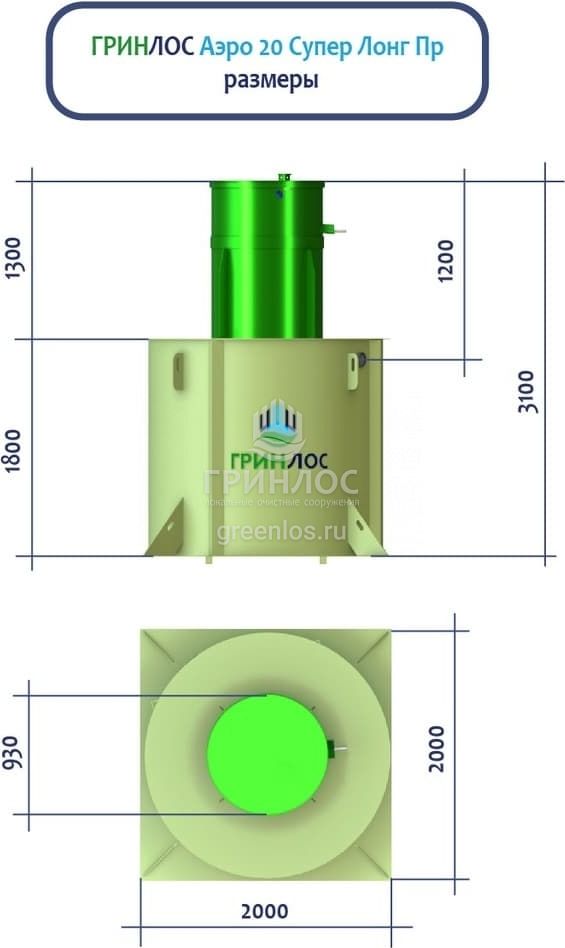 ГРИНЛОС Аэро 20 Пр Супер Лонг – это станция биологической очистки сточных вод аэрационного типа. Максимальный залповый сброс в септик равен 1300 л, а производительность станции равна 3.5 м3/сутки, что рассчитано на обслуживание 20 условных пользователей.