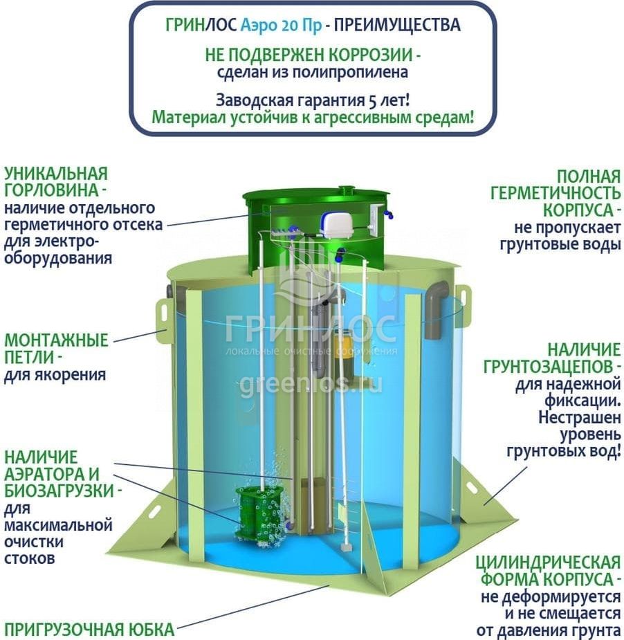 Отличительными особенностями септика ГРИНЛОС Аэро 20 Пр являются: