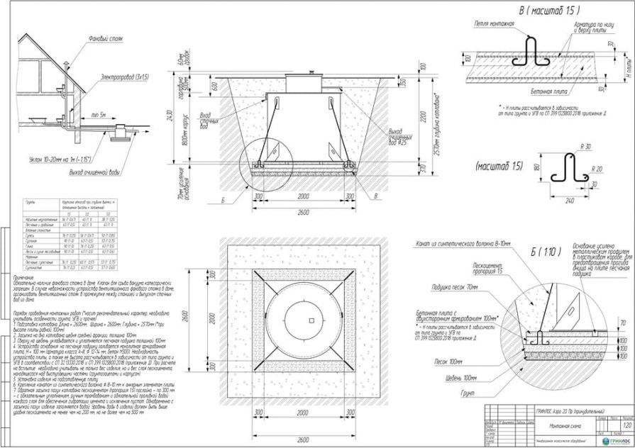 Целесообразно доверить выбор и монтаж оборудования специализированной компании. Перед непосредственным монтажом Оборудования специалисты осуществляют подготовку котлована. Его размеры определяются конструктивными особенностями выбранной модели оборудования. Ознакомиться с данными параметрами можно в приложении к ПС. По боковым стенкам корпуса должно быть сохранено свободное расстояние до грунта не менее 250 мм. Дно котлована нуждается в более тщательной подготовке. Его подвергают выравниванию с последующей засыпкой слоем песка, обладающим толщиной в пределах 10-15 см. Пазухи котлована подвергают обратной засыпке при помощи песка, который послойно поливают водой. Прежде чем приступить к аналогичным работам, емкость оборудования на четверть заполняют водой. Впоследствии количество воды внутри емкости увеличивают соразмерно уровню засыпки песком наружных стенок. Каждые 200 мм песка подвергаются ручному уплотнению.