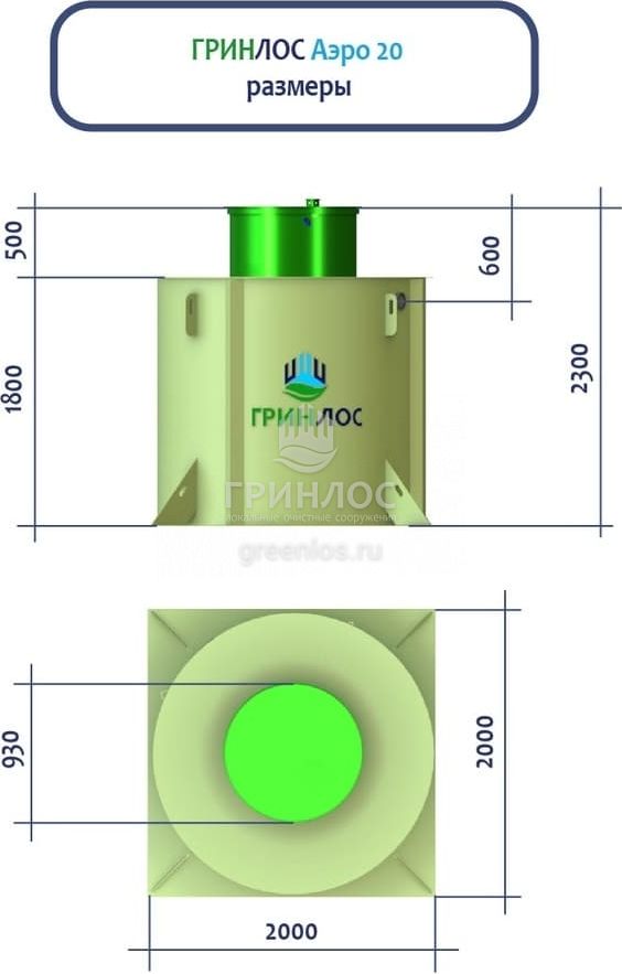 ГРИНЛОС Аэро 20 — это самотечная модель аэрационной установки биологической очистки с залповым сбросом 1300 л и производительностью 3.5 м3/сутки, что делает его подходящим для домов, в которых число жильцов не превышает 20 условных пользователей.