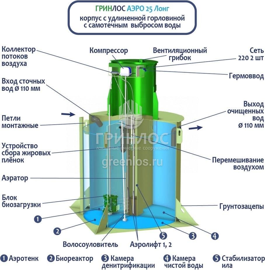 Станция ГРИНЛОС Аэро 25 Лонг сконструирована таким образом, что все камеры, в которых происходит аэрация, разделение и осветление стоков объединены в одном корпусе цилиндрической или овальной формы.