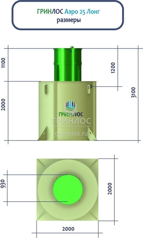 ГРИНЛОС Аэро 25 Лонг – это станция биологической очистки сточных вод аэрационного типа. Максимальный залповый сброс в септик равен 1500 л, а производительность станции равна 4 м3/сутки, что рассчитано на обслуживание 25 условных пользователей.