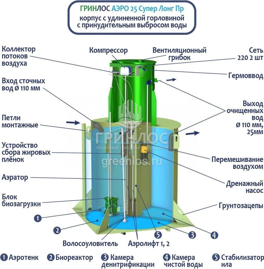 Естественный природный процесс в ГРИНЛОС Аэро 25 Пр Супер Лонг оптимизирован путем аэрации стоков и установки биофильтра (специального устройства, на котором образуется биопленка из микроорганизмов). Благодаря использованию двух видов ила – свободного и фиксированного, достигается более высокая степень очистки, удлиняется временной интервал планового обслуживания.