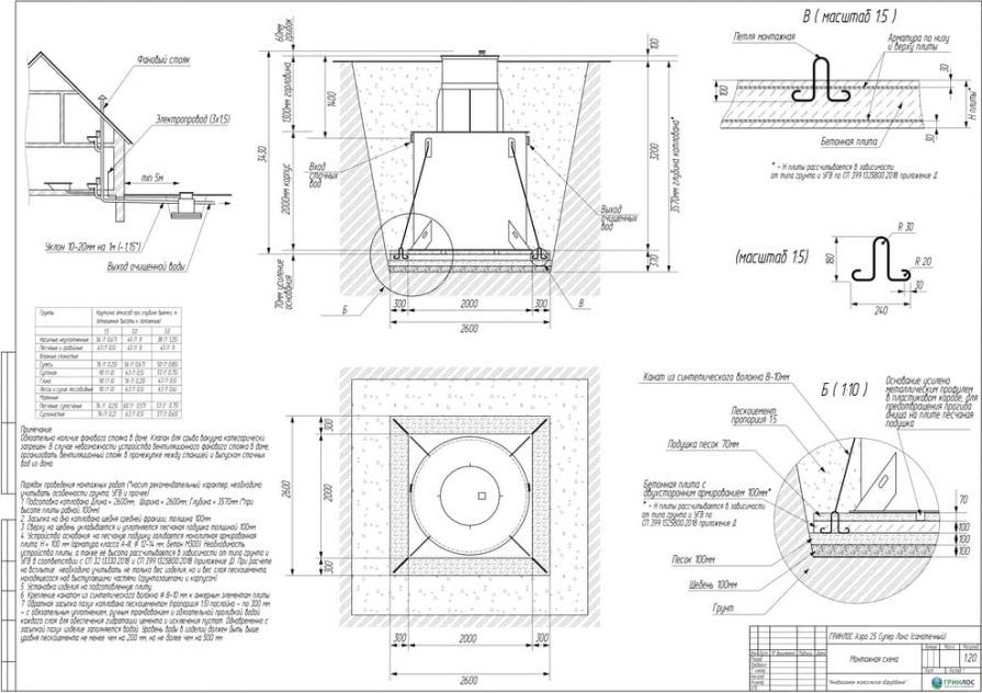 Целесообразно доверить выбор и монтаж оборудования специализированной компании. Перед непосредственным монтажом Оборудования специалисты осуществляют подготовку котлована. Его размеры определяются конструктивными особенностями выбранной модели оборудования. Ознакомиться с данными параметрами можно в приложении к ПС. По боковым стенкам корпуса должно быть сохранено свободное расстояние до грунта не менее 250 мм. Дно котлована нуждается в более тщательной подготовке. Его подвергают выравниванию с последующей засыпкой слоем песка, обладающим толщиной в пределах 10-15 см. Пазухи котлована подвергают обратной засыпке при помощи песка, который послойно поливают водой. Прежде чем приступить к аналогичным работам, емкость оборудования на четверть заполняют водой. Впоследствии количество воды внутри емкости увеличивают соразмерно уровню засыпки песком наружных стенок. Каждые 200 мм песка подвергаются ручному уплотнению.
