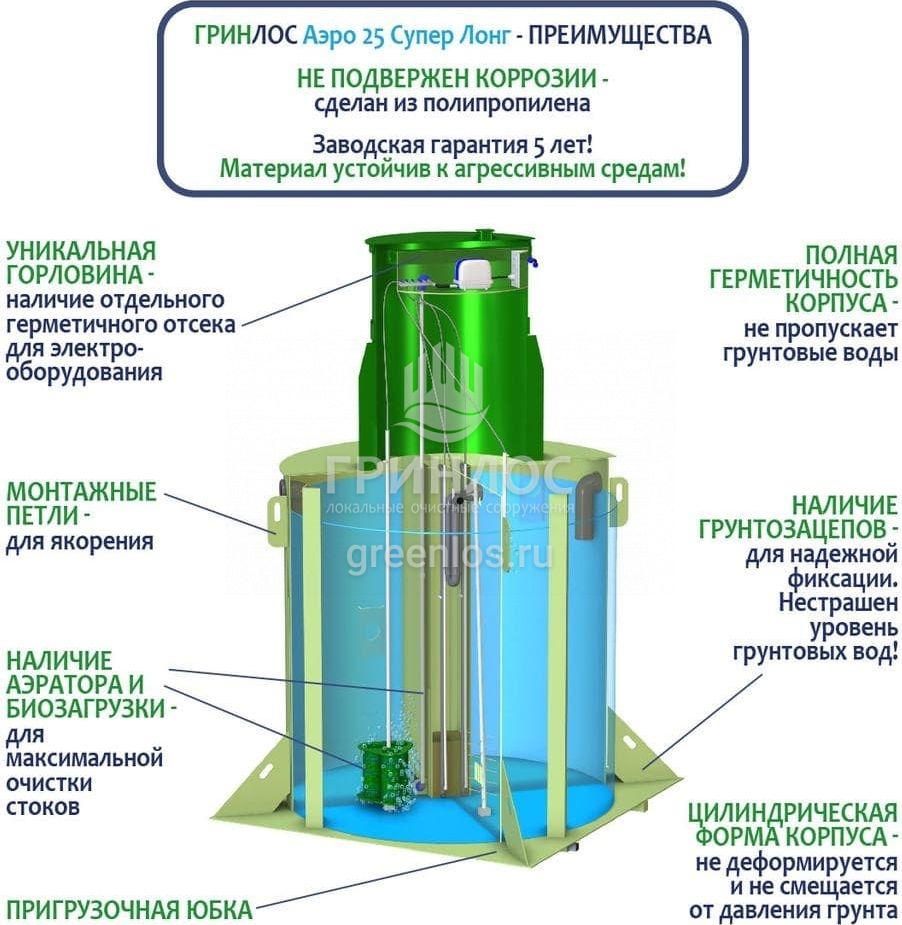 Станции биологической очистки ГРИНЛОС Аэро 25 Супер Лонг предназначены для расщепления и переработки основных органических загрязнений, содержащихся в бытовых сточных водах. Эти процессы происходят в результате жизнедеятельности аэробных микроорганизмов, условия для жизнедеятельности которых создает ЛОС.