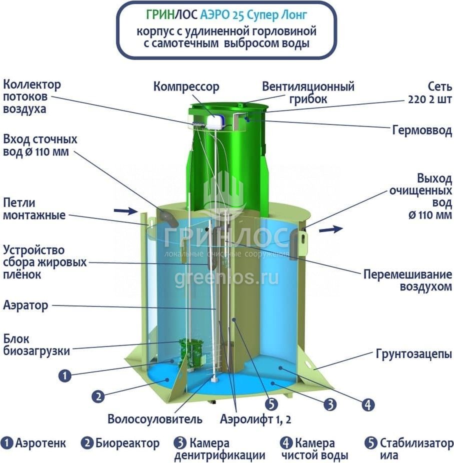 Станция ГРИНЛОС Аэро 25 Супер Лонг сконструирована таким образом, что все камеры, в которых происходит аэрация, разделение и осветление стоков объединены в одном корпусе цилиндрической или овальной формы.