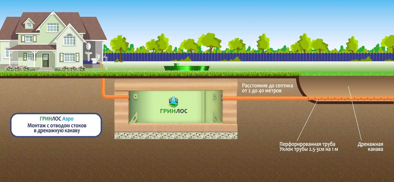 Монтаж с самотечным отводом очищенных сточных вод в дренажную канаву. Подходит для хорошо впитывающих грунтов (песок, супесь) и низком уровне грунтовых вод. При выборе данного способа водоотведения необходимо обеспечить свободное отведение очищенной воды от выпуска трубопровода, необходимо полностью исключить под-топление выпуска. В противном случае, в летний период, трубопровод будет заиливаться и засоряться, а Станция будет подвержена обратному затоплению водами с точки сброса. В зимний период, трубопровод и точка сброса будут промерзать. Такие условия работы оборудования приведут к аварии.