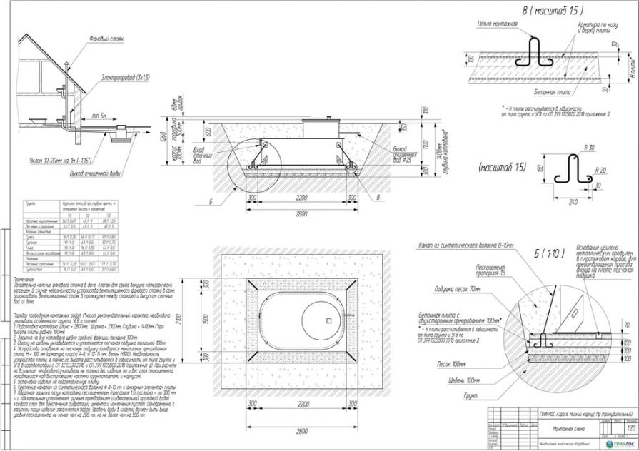 Целесообразно доверить выбор и монтаж оборудования специализированной компании. Перед непосредственным монтажом Оборудования специалисты осуществляют подготовку котлована. Его размеры определяются конструктивными особенностями выбранной модели оборудования. Ознакомиться с данными параметрами можно в приложении к ПС. По боковым стенкам корпуса должно быть сохранено свободное расстояние до грунта не менее 250 мм. Дно котлована нуждается в более тщательной подготовке. Его подвергают выравниванию с последующей засыпкой слоем песка, обладающим толщиной в пределах 10-15 см. Пазухи котлована подвергают обратной засыпке при помощи песка, который послойно поливают водой. Прежде чем приступить к аналогичным работам, емкость оборудования на четверть заполняют водой. Впоследствии количество воды внутри емкости увеличивают соразмерно уровню засыпки песком наружных стенок. Каждые 200 мм песка подвергаются ручному уплотнению.