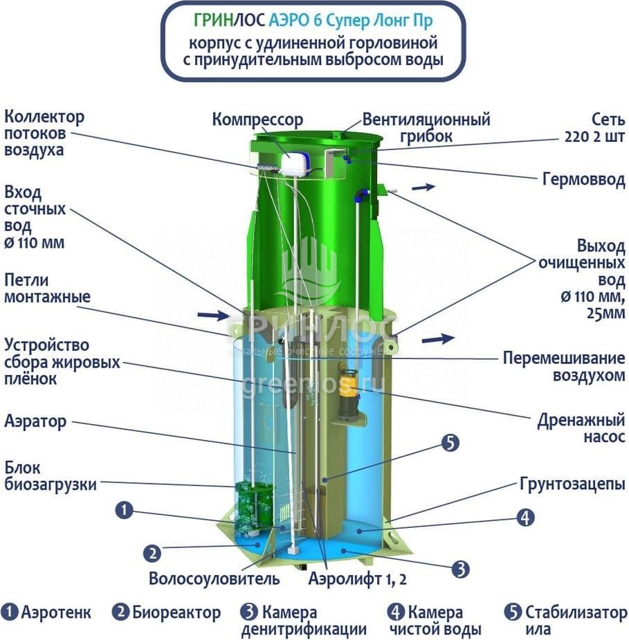 Естественный природный процесс в ГРИНЛОС Аэро 6 Пр Супер Лонг оптимизирован путем аэрации стоков и установки биофильтра (специального устройства, на котором образуется биопленка из микроорганизмов). Благодаря использованию двух видов ила – свободного и фиксированного, достигается более высокая степень очистки, удлиняется временной интервал планового обслуживания.