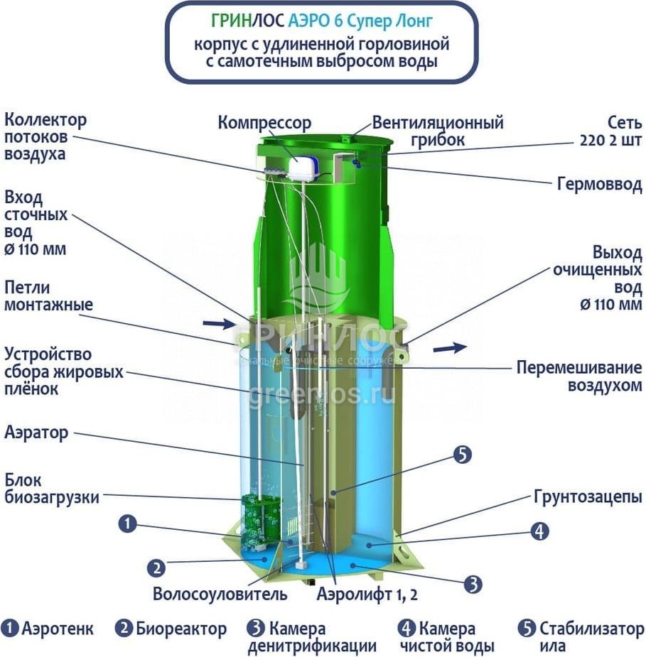Станция ГРИНЛОС Аэро 6 Супер Лонг сконструирована таким образом, что все камеры, в которых происходит аэрация, разделение и осветление стоков объединены в одном корпусе цилиндрической или овальной формы.
