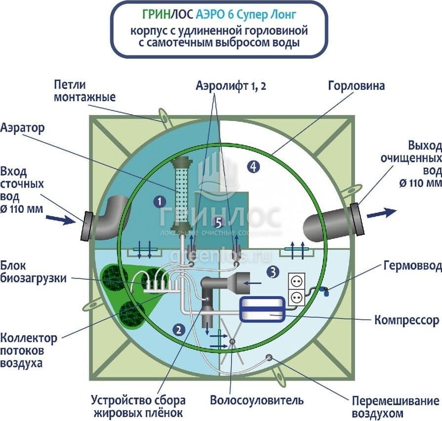 Естественный природный процесс в ГРИНЛОС Аэро 6 Супер Лонг оптимизирован путем аэрации стоков и установки биофильтра (специального устройства, на котором образуется биопленка из микроорганизмов). Благодаря использованию двух видов ила – свободного и фиксированного, достигается более высокая степень очистки, удлиняется временной интервал планового обслуживания.