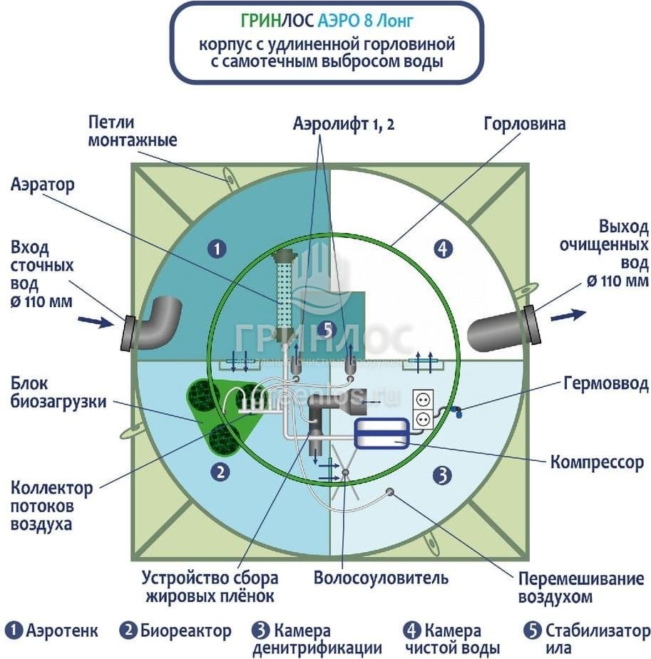 Станция ГРИНЛОС Аэро 8 Лонг сконструирована таким образом, что все камеры, в которых происходит аэрация, разделение и осветление стоков объединены в одном корпусе цилиндрической или овальной формы.