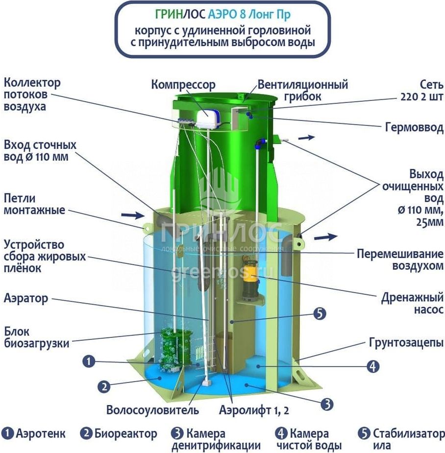 Станция ГРИНЛОС Аэро 8 Пр Лонг сконструирована таким образом, что все камеры, в которых происходит аэрация, разделение и осветление стоков объединены в одном корпусе цилиндрической или овальной формы.