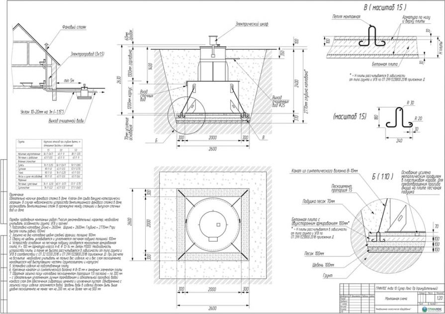 Целесообразно доверить выбор и монтаж оборудования специализированной компании. Перед непосредственным монтажом Оборудования специалисты осуществляют подготовку котлована. Его размеры определяются конструктивными особенностями выбранной модели оборудования. Ознакомиться с данными параметрами можно в приложении к ПС. По боковым стенкам корпуса должно быть сохранено свободное расстояние до грунта не менее 250 мм. Дно котлована нуждается в более тщательной подготовке. Его подвергают выравниванию с последующей засыпкой слоем песка, обладающим толщиной в пределах 10-15 см. Пазухи котлована подвергают обратной засыпке при помощи песка, который послойно поливают водой. Прежде чем приступить к аналогичным работам, емкость оборудования на четверть заполняют водой. Впоследствии количество воды внутри емкости увеличивают соразмерно уровню засыпки песком наружных стенок. Каждые 200 мм песка подвергаются ручному уплотнению.