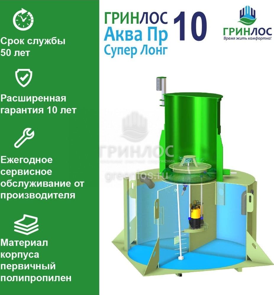 ГРИНЛОС Аква 10 Пр Супер Лонг – это бескомпрессорная станция переработки сточных вод. Конструкция данного септика позволяет принимать не более 860 л залпом, а производительность станции равна 2.8 м3/сутки. Септик подходит для комфортного проживания 10 человек.